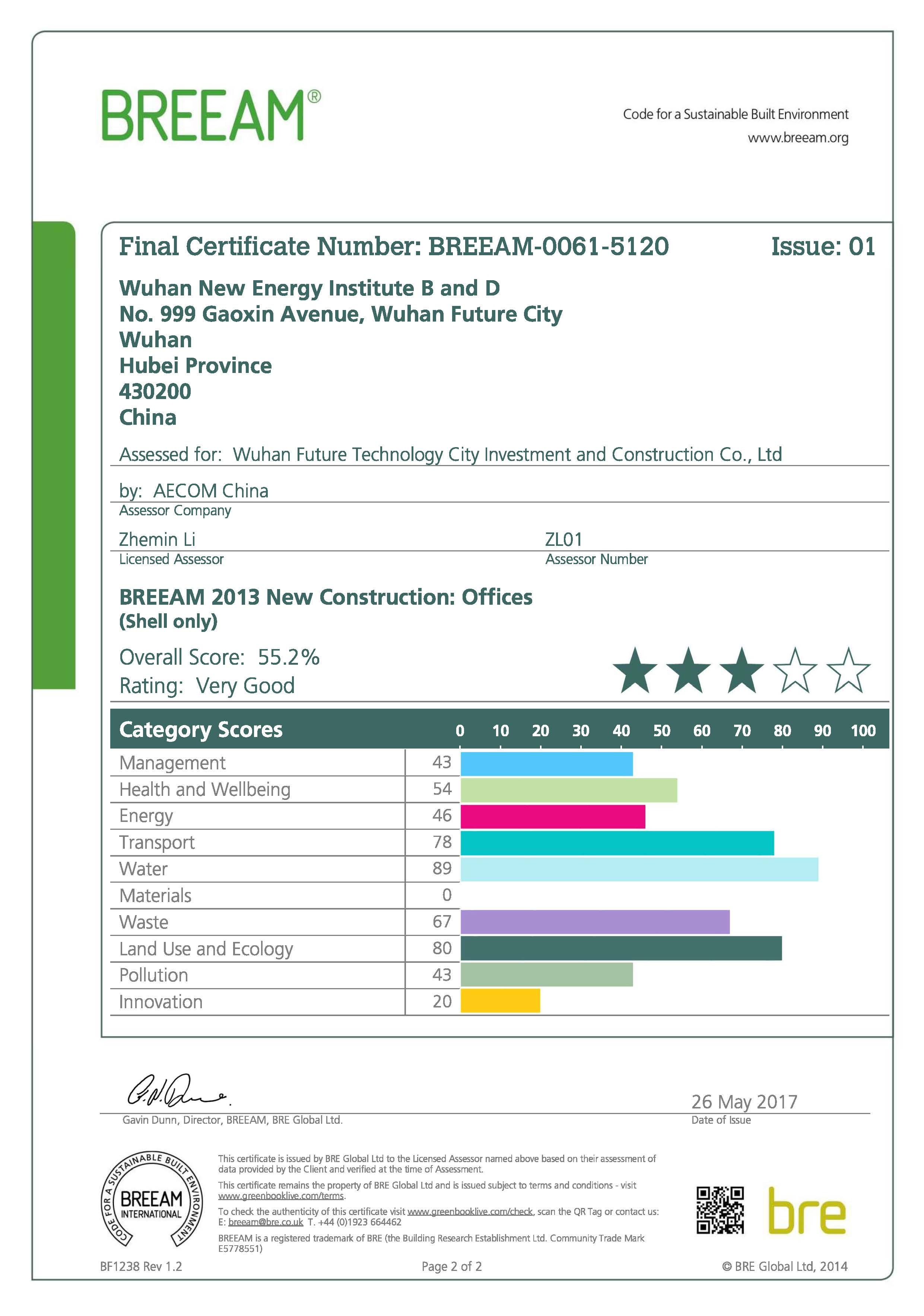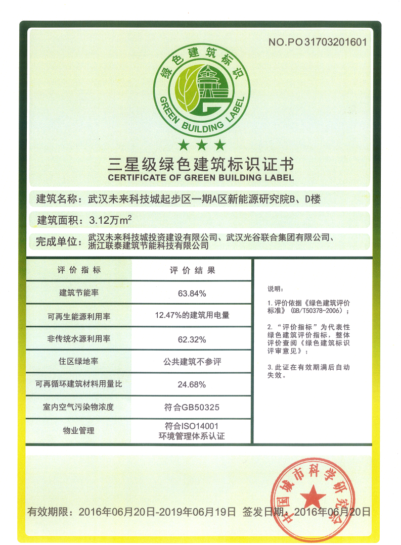 2017年11月9日,英国贸易与出口促进部长罗娜·费尔海德莅临武汉,与武汉市市长万勇共同见证了世界权威机构BRE英国建筑研究院,将BREEAM三星级认证证书颁发给武汉市首个获得该证书的武汉新能源研究院办公楼——武汉能源之花。