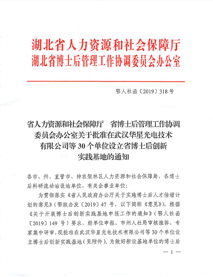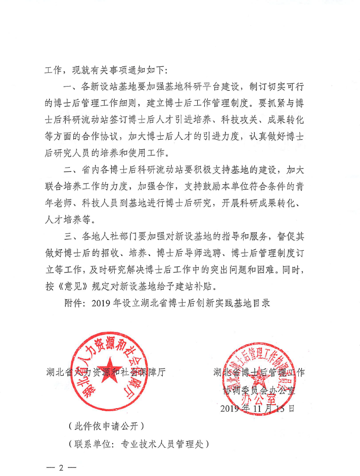 11月15日,经单位申报、市州人社局审核推荐、专家集中评审,湖北省人力资源和社会保障厅和湖北省博士后管理工作协调委员会办公室批准我院设立“湖北省博士后创新实践基地”。