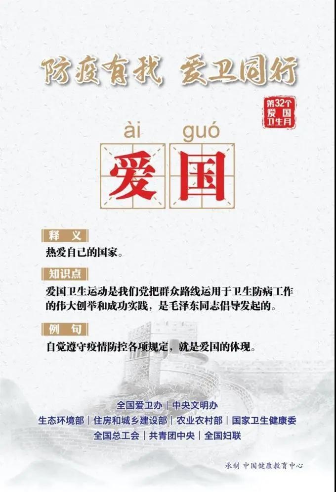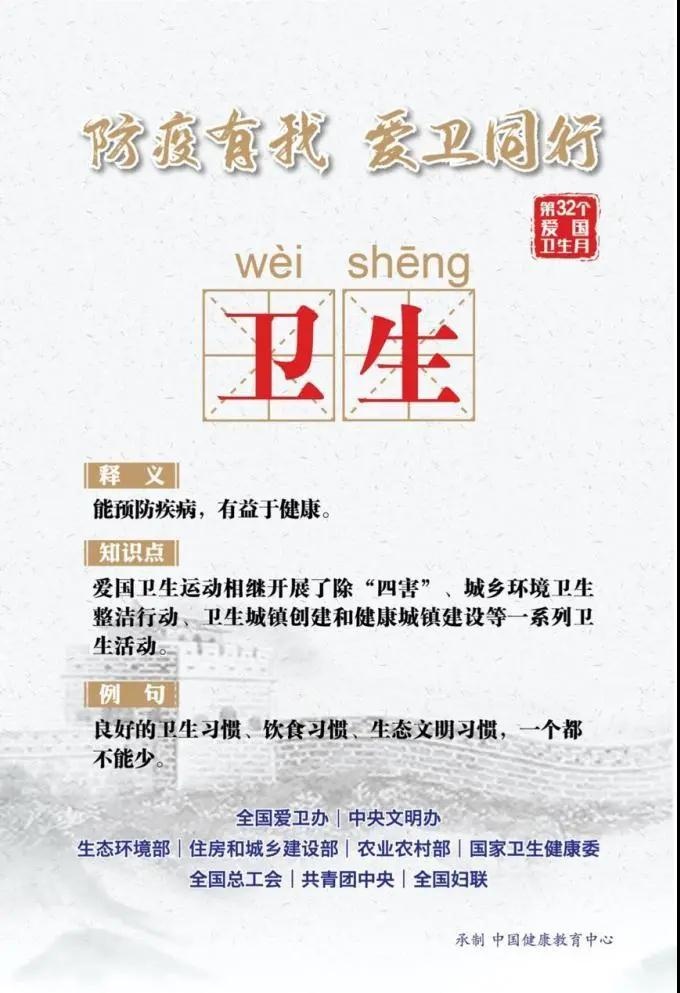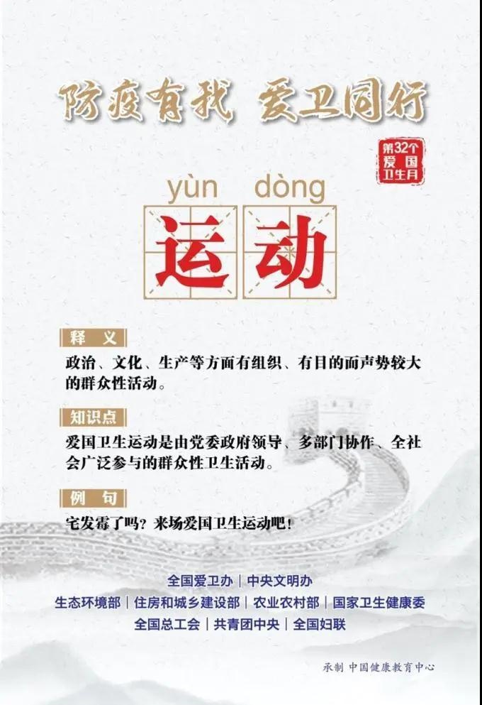 自1989年起,全国爱国卫生月定于每年4月。开展这一活动的目的是强化大卫生观念,动员和依靠全社会力量,集中时间和力量,解决群众意见最大而又可能解决的一两个社会性卫生问题。同时,通过爱国卫生月的活动促进经济性卫生工作的开展,提高群众自我保健和共同改善生存环境的意识。让我们通过一组海报进一步了解今年的“爱国卫生运动”